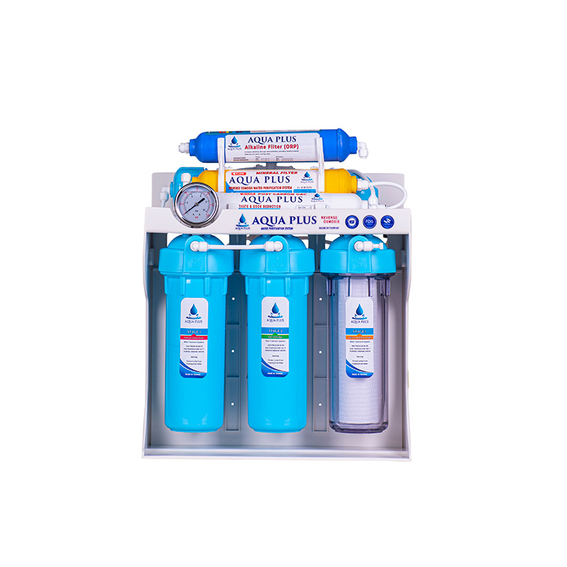 دستگاه تصفیه آب شش مرحله ای خانگی آکوا پلاس (PI1-ORP) با سیستم اسمز معکوس RO (ساخت کشور تایوان) در طی 7 مرحله توسط 7 فیلتر آب را تصفیه میکند.